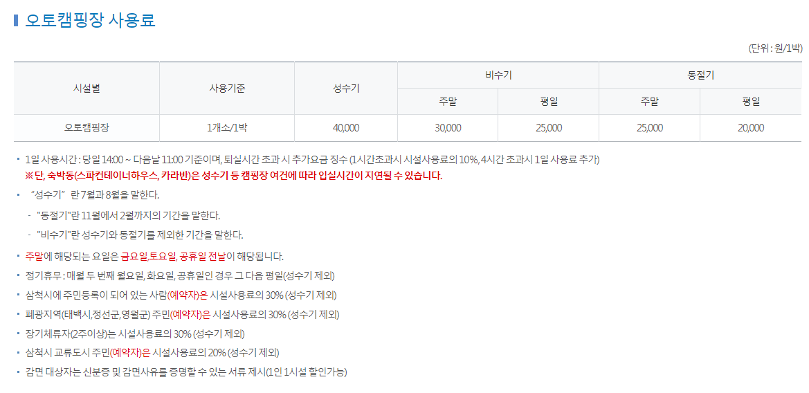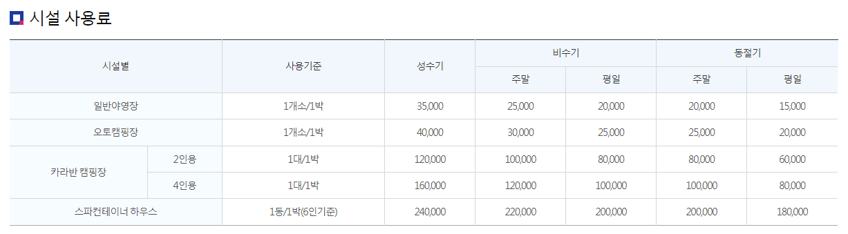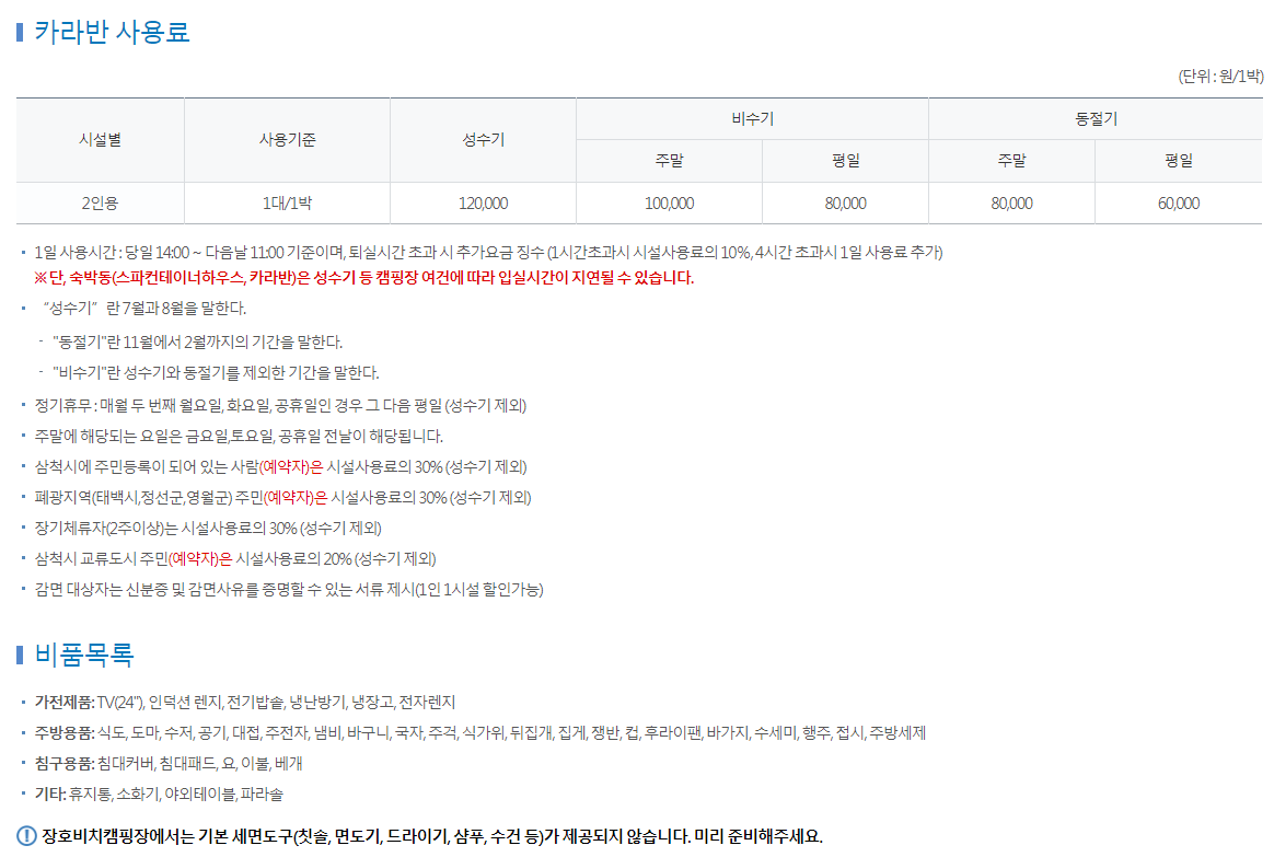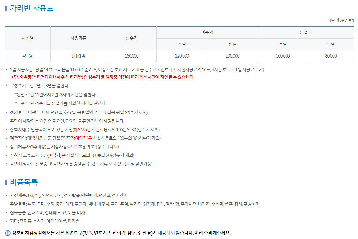 사용기준 : 1대 / 1박 성수기 120,000원, 비수기 100,000원 (주말) / 80,000원(평일), 동절기 80,000원(주말) / 60,000원(평일)