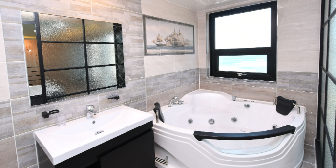 2층(32㎡, 테라스 미포함 면적) : 월풀, 침대, 화장실, 테라스(16㎡)