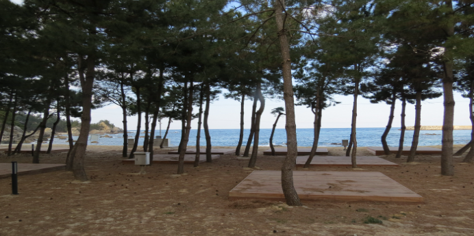 소나무 숲에 조성된 캠핑장으로 캠핑장 앞에서 아름다운 해변을 감상할 수 있어요.
