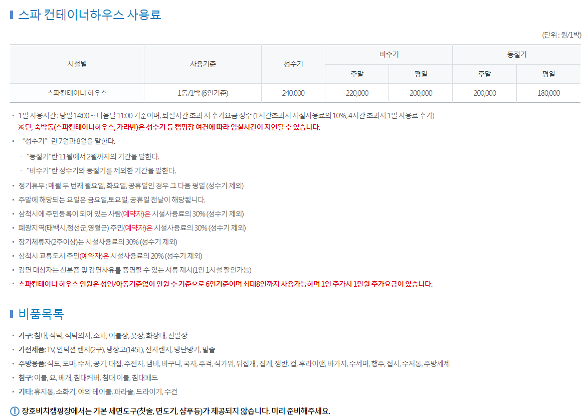 스파컨테이너 하우스사용기준 : 1동/1박(6인기준)성수기 : 240,000원, 비수기 220,000(주말) / 200,000(평일), 동절기 200,000원(주말) / 180,000(평일)