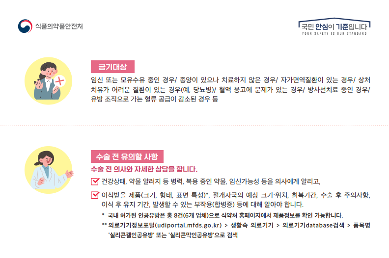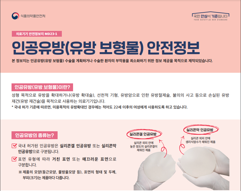 식품의약품안전처의 인공유방(유방보형물) 안전정보지는 인공유방(유방 보형물) 수술을 계획하거나 수술한 환자의 부작용을 최고화 하기 위한 정보 제공을 목적으로 제작된 정보지이니 참고해 주세요.