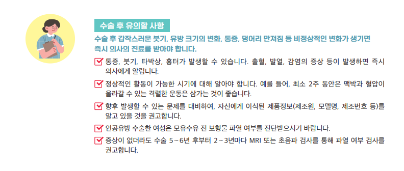 수술 후 갑작스러운 붓기, 유방 크기의 변화, 통증, 덩어리 만져짐 등 비정상적인 변화가 생기면 즉시 의사의 진료를 받아야 합니다.