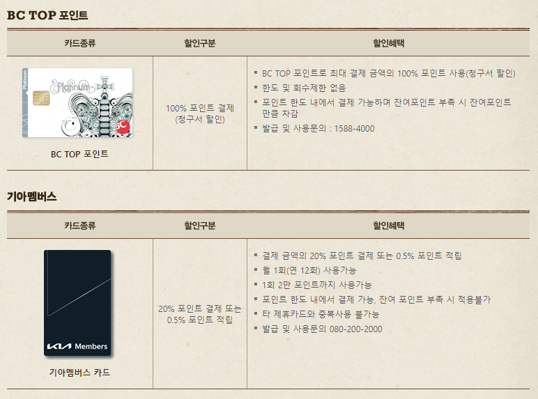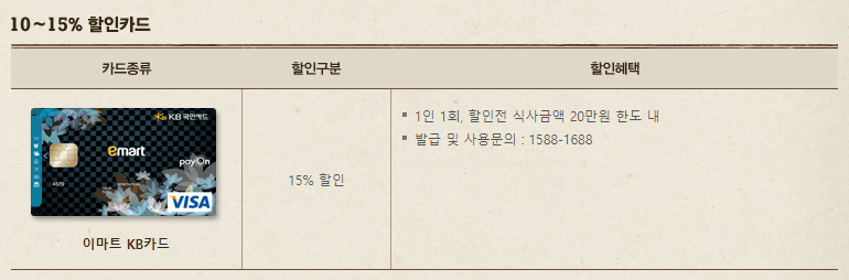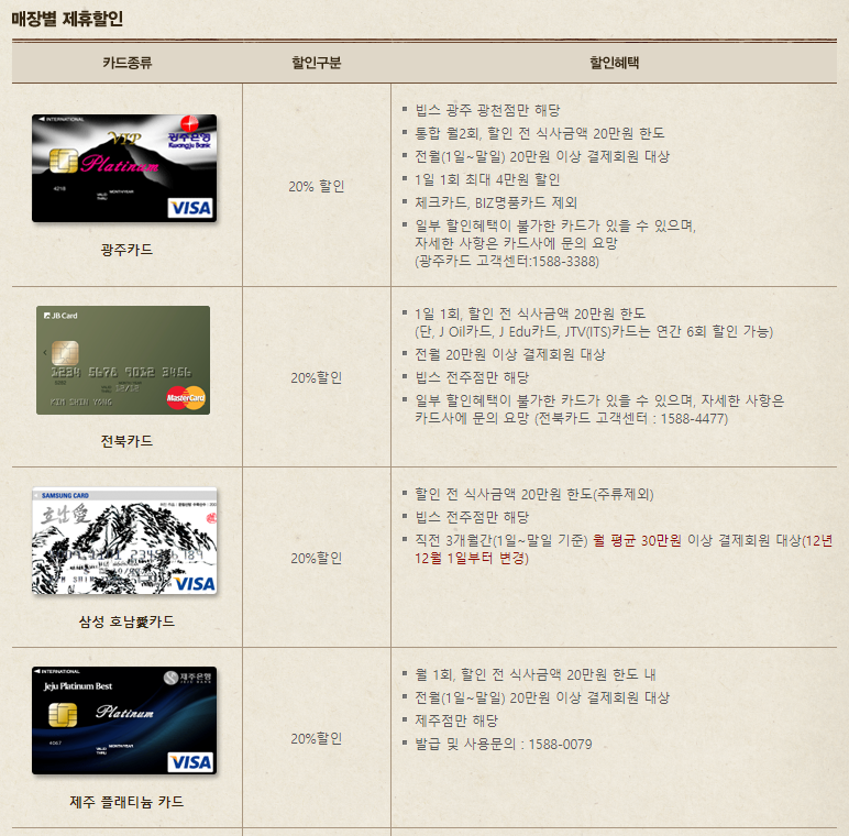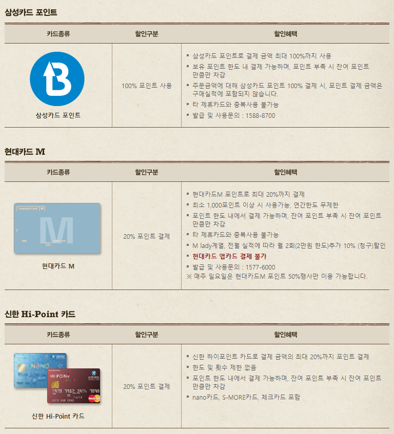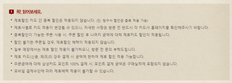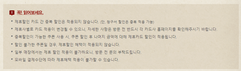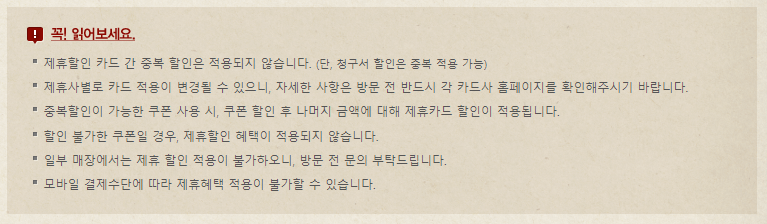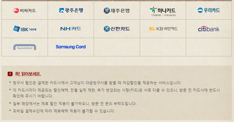 제휴사별로 카드 적용이 변경될 수 있으니 방문 전 반드시 카드사 홈페이지 확인해 주세요.