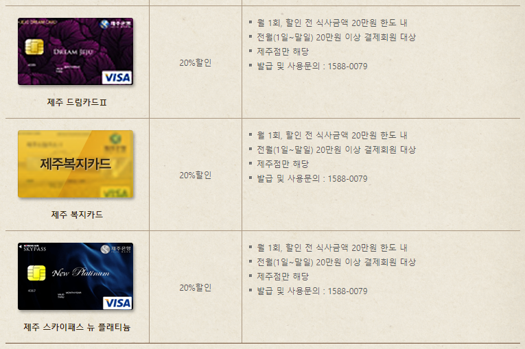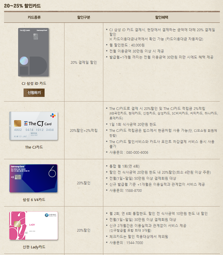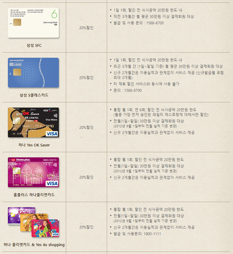 The CJ 카드 - 20% 할인 + 2% 적립삼성 6 V4 카드 - 20% 할인신한 Lady 카드 - 20% 할인삼성 SFC 카드 - 20% 할인삼성 S클래스카드 - 20% 할인하나 Yes OK Saver 카드 - 20% 할인홈플러스 하나줄리엣카드 - 20% 할인하나 줄리엣 & Yes 4u shopping 카드 - 20% 할인KB Star 카드 - 20% 할인