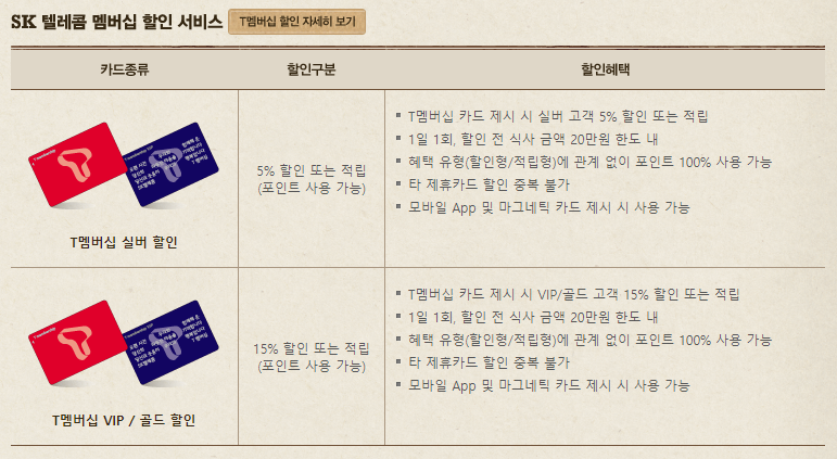 T 멤버십 실버 할인 - 5% 할인 또는 적립(포인트 사용 가능)T 멤버십 VIP / 골드 할인 - 15% 할인 또는 적립(포인트 사용 가능)