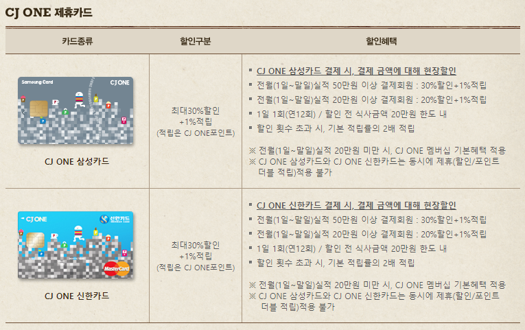 CJ ONE 삼성카드 - 최대 30% 할인 + 1% 적립(적립은 CJ ONE 포인트)