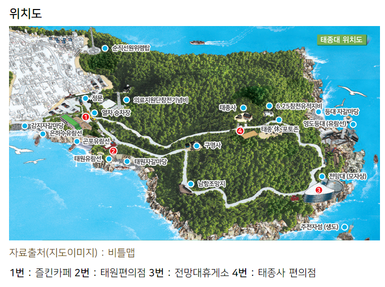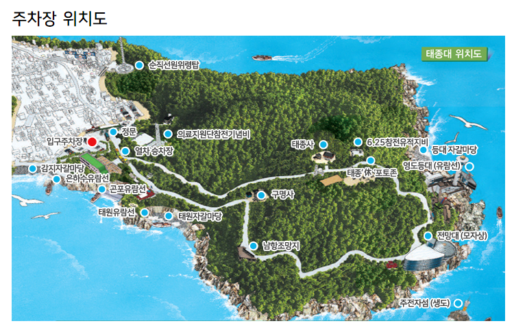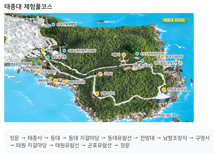 정문 → 태종사 → 등대 → 등대 자갈마당 → 등대유람선 → 전망대 → 남항조망지 → 구명사 → 태원 자갈마당 → 태원 유람선 → 곤포 유람선 → 정문