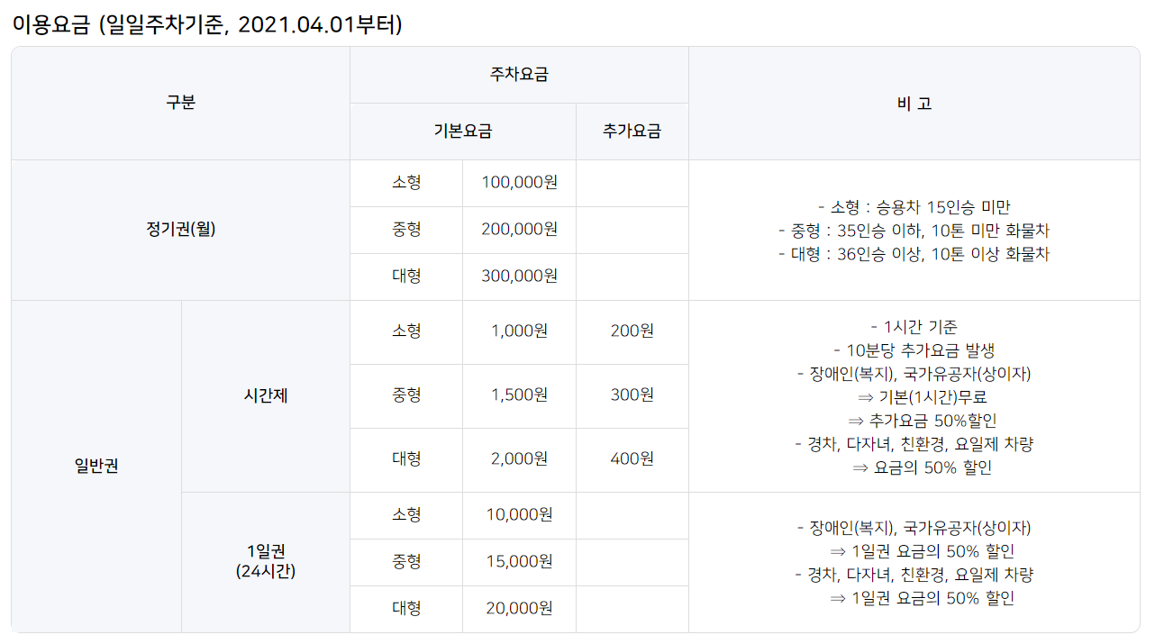 ◈ 이용요금 (일일주차기준, 2021. 04. 01.부터)