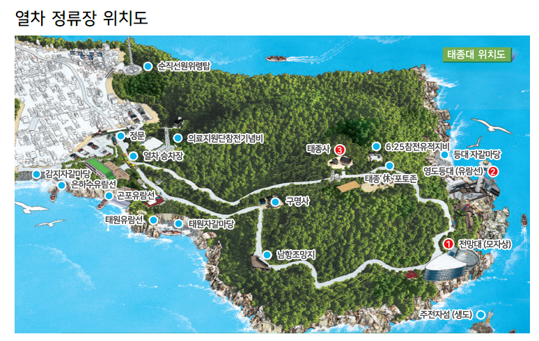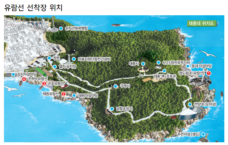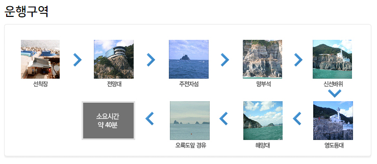 선착장 > 전망대 > 주전자섬 > 망부석 > 신선바위 > 영도등대 > 해양대 > 오륙도 앞 경유 > 소요시간 약 40분