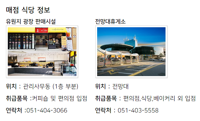 ◈ 매점 식당 정보 (유원지 광장 판매시설, 전망대 휴게소)