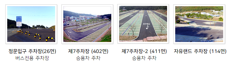 정문입구 주차장(26면), 제7주차장(402면), 제7주차장-2(411면), 자유랜드 주차장(114면)