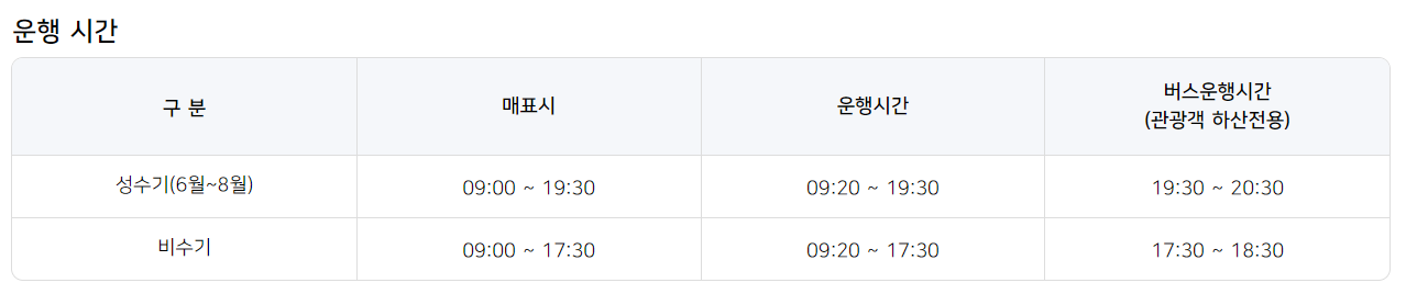 - 매표는 운행종료 2~3시간 전 조기에 마감될 수 있습니다.
