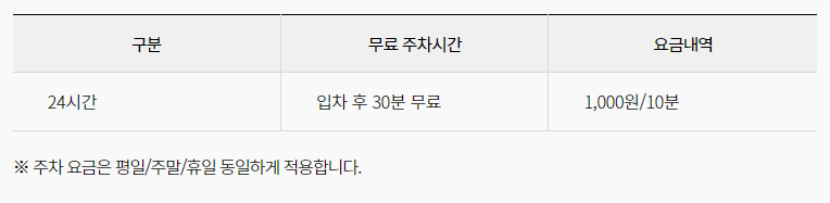 24시간 / 입차 후 30분 무료 / 1,000원(10분)
