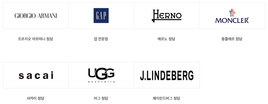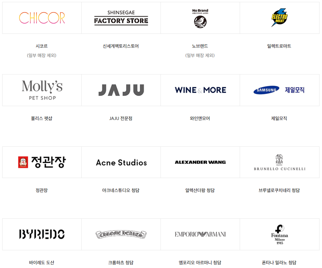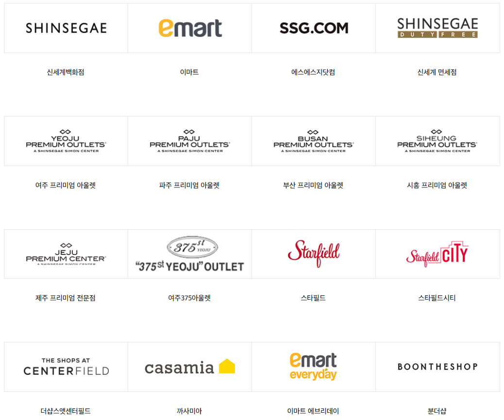 신세계백화점, 이마트, 에스에스지닷컴, 신세계면세점, 여주 프리미엄 아울렛, 파주 프리미엄 아울렛, 부산 프리미엄 아울렛, 시흥 프리미엄 아울렛, 제주 프리미엄 전문점, 여주375아울렛, 스타필드, 스타필드시티, 더샵스앳센터필드, 까사미아, 이마트 에브리데이, 분더샵, 시코르(일부 매장 제외), 신세계팩토리스토어, 노브랜드(일부 매장 제외), 일렉트로마트, 몰리스 펫샵, JAJU (자주) 전문점, 와인앤모어, 제일모직, 정관장, 아크네스튜디오 청담, 알렉산더왕 청담, 브루넬로쿠치네리 청담, 바이레도 도산, 크롬하츠 청담, 엠포리오 아르마니 청담, 폰타나 밀라노 청담, 조르지오 아르마니 청담, 갭 전문점, 에르노 청담, 몽클레르 청담, 사카이 청담, 어그 청담, 제이린드버그 청담