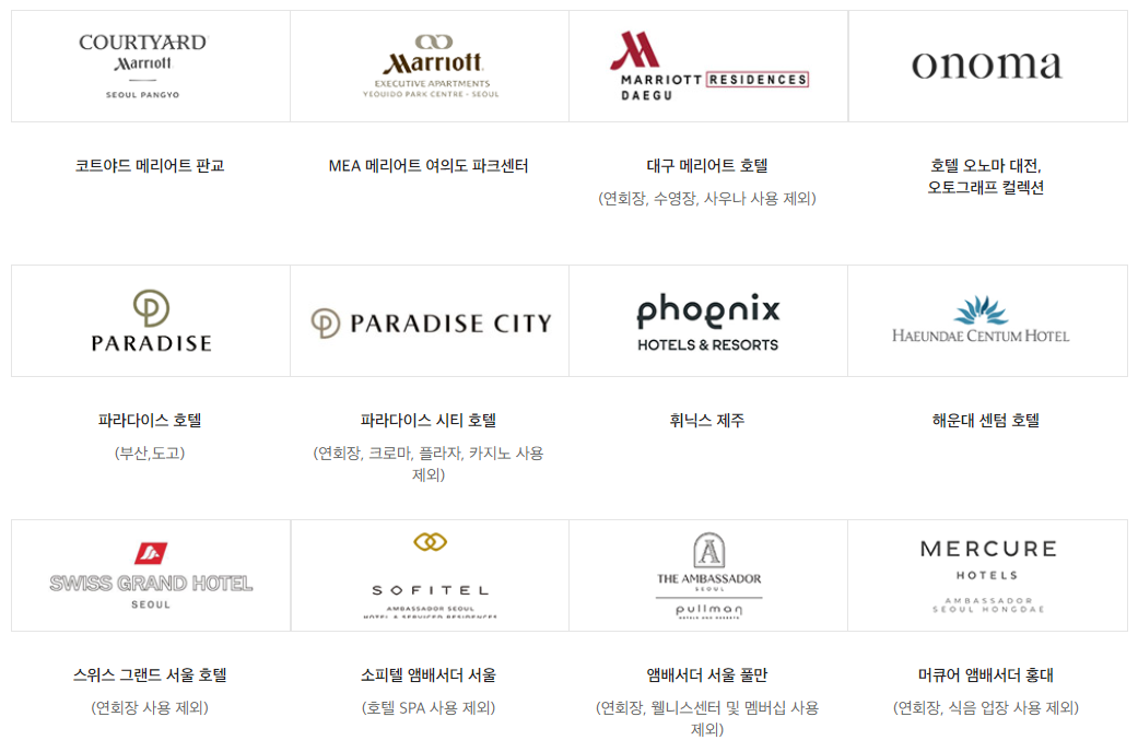 JW 메리어트 제주 리조트&스파, 코랄로 바이 조선, JW 메리어트 호텔 서울, 웨스틴 조선(서울, 부산), 그랜드 조선(부산, 제주), 조선팰리스 서울 강남, 럭셔리 컬렉션 호텔, 그래비티 서울 판교, 오토그래프 컬렉션, 레스케이프, 포포인츠 바이 쉐라톤 조선(서울역, 서울 명동), 신세계 영랑호 리조트, JW 메리어트 동대문 스퀘어 서울, 코트야드 메리어트 타임스퀘어, 코트야드 메리어트 판교, MEA 메리어트 여의도 파크센터, 대구 메리어트 호텔(연회장, 수영장, 사우나 사용 제외), 호텔 오노마 대전, 오토그래프트 컬렉션, 파라다이스 호텔(부산, 도고), 파라다이스 시티 호텔(연회장, 크로마, 플라자, 카지노 사용 제외), 휘닉스 제주, 해운대 센텀 호텔, 스위스 그랜드 서울 호텔(연회장 사용 제외), 소피텔 앰배서더 서울(호텔 SPA 사용 제외), 앰배서더 서울 풀만(연회장, 웰니스센터 및 멤버십 사용 제외), 머큐어 앰배서더 홍대(연회장, 식음 업장 사용 제외)