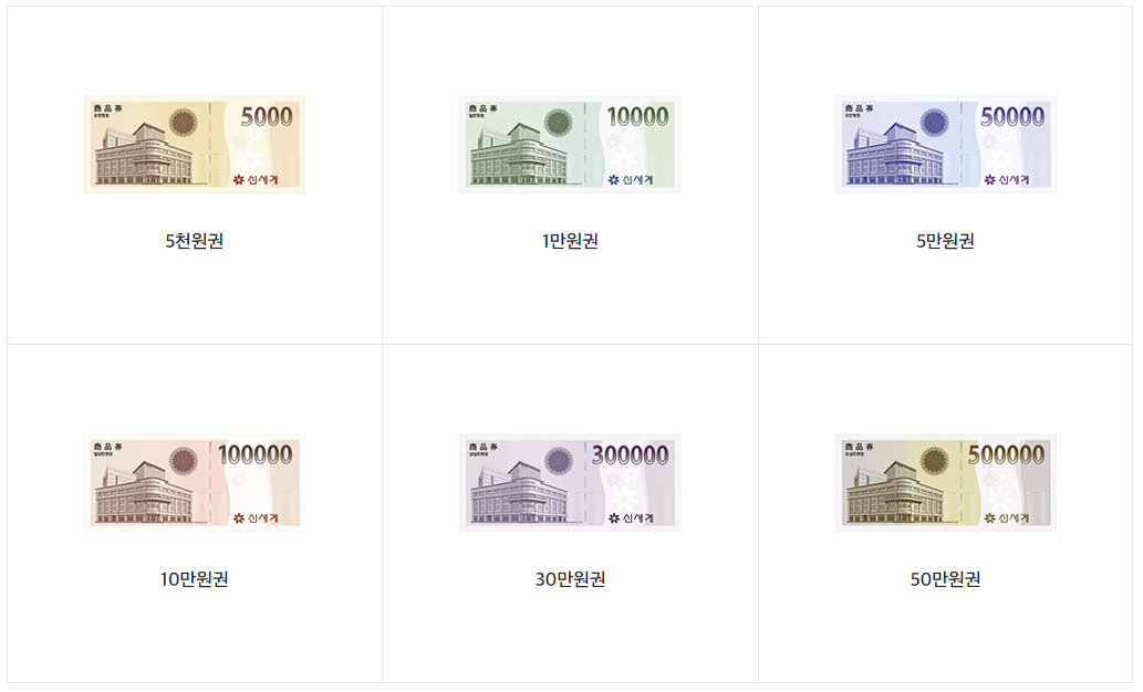 신세계상품권은 5천 원, 1만 원, 5만 원, 10만 원, 30만 원, 50만 원 - 총 6종