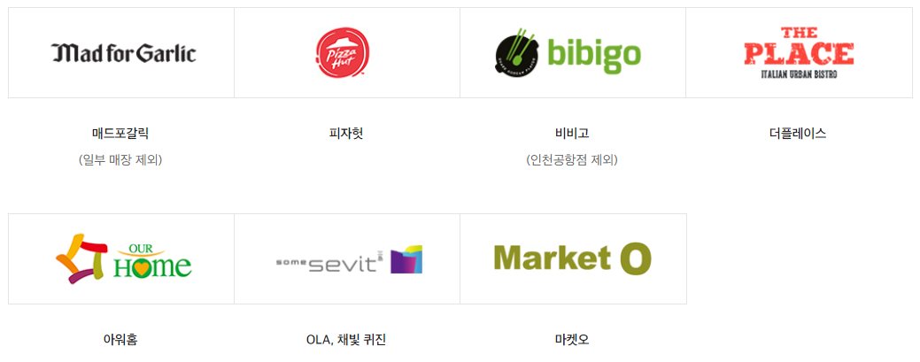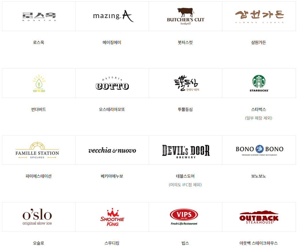 로스옥, 메이징에이, 붓처스컷, 삼원가든, 썬더버드, 오스테리아꼬또, 투뿔등심, 스타벅스(일부 매장 제외), 파미에스테이션, 베키아에누보, 데블스도어(여의도IFC점 제외), 보노보노, 오슬로, 스무디킹, 빕스, 아웃백 스테이크하우스, 매드포갈릭(일부 매장 제외), 피자헛, 비비고(인천공항점 제외), 더플레이스, 아워홈, OLA, 채빛 퀴진, 마켓오