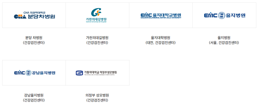 분당 차병원(건강검진센터), 가천의대길병원(건강검진센터), 을지대학병원(대전, 건강검진센터), 을지병원(서울, 건강검진센터), 강남을지병원(건강검진센터), 의정부 성모병원(건강검진센터)