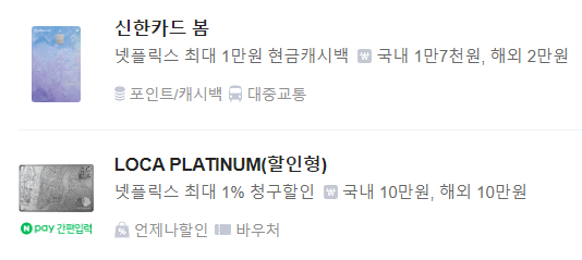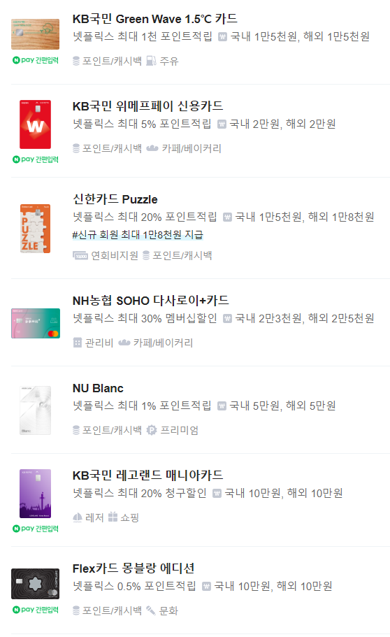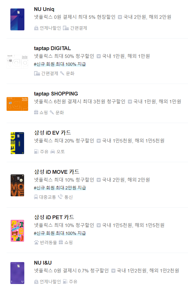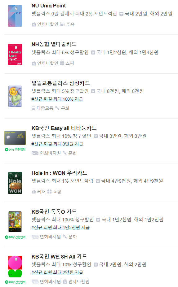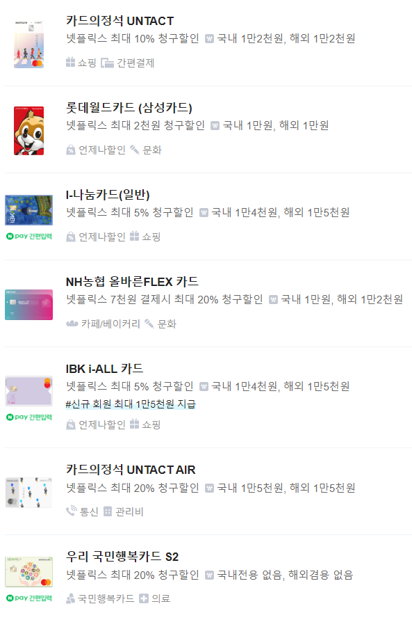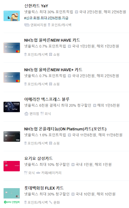 롯데카드, 삼성카드, NH농협카드, 우리카드, IBK 기업은행카드, 국민카드, BC카드(비씨카드), 현대카드, 신한카드 중