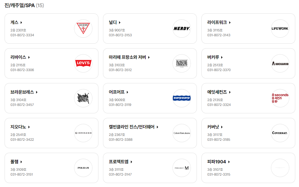 어프어프, 에잇세컨즈, 지오다노, 캘빈클라인진스/언더웨어, 커버낫, 폴햄, 프로젝트엠, 피파1904