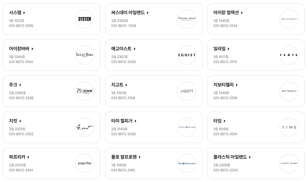 지고트, 지보티첼리, 지컷, 타미 힐피거, 타임, 파프리카, 폴로 랄프로렌, 플라스틱 아일랜드, 헤지스