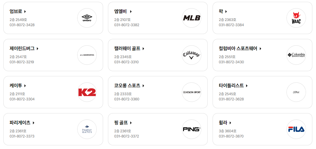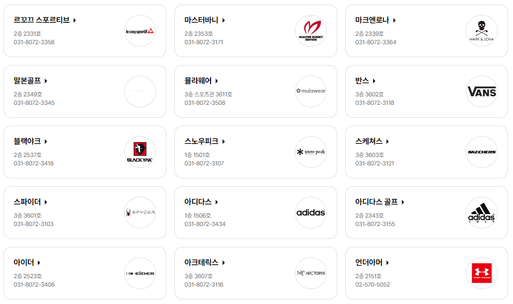 말본골프, 뮬라웨어, 반스, 블랙야크, 스노우피크, 스케쳐스, 스파이더,