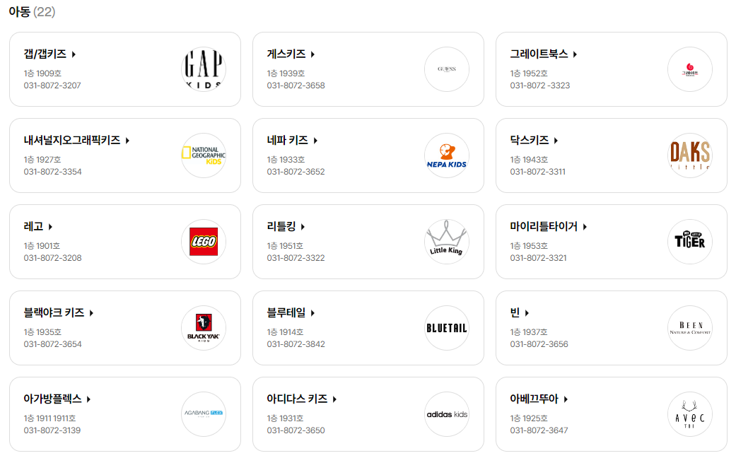 빈, 아가방플렉스, 아디다스 키즈, 아베끄뚜아, 앙팡스, 엠엘비 키즈,