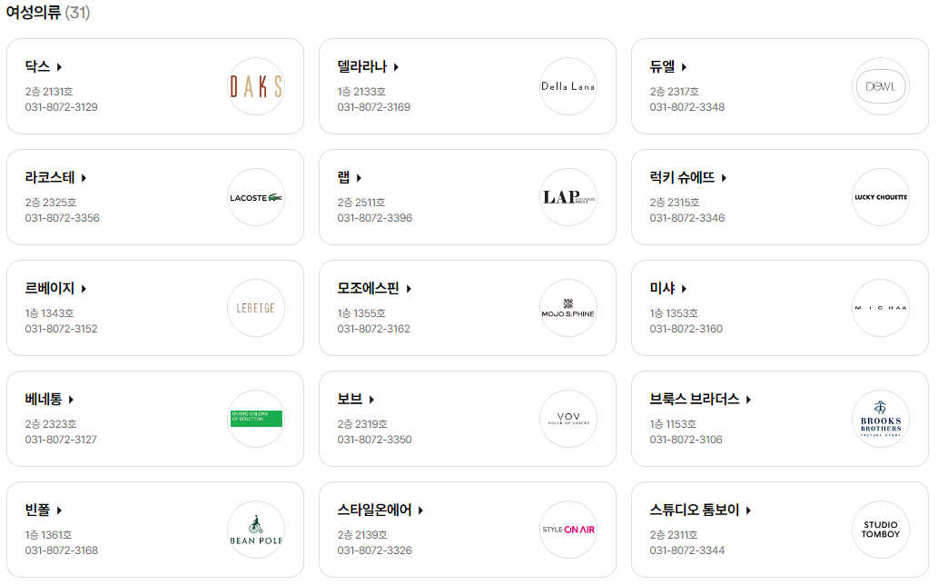디케이앤와이, 띠어리, 마쥬, 맨온더분, 바버, 산드로, 씨피 컴퍼니, 아이엠지 프리미엄, 질스튜어트, 캘빌클라인 플래티넘
