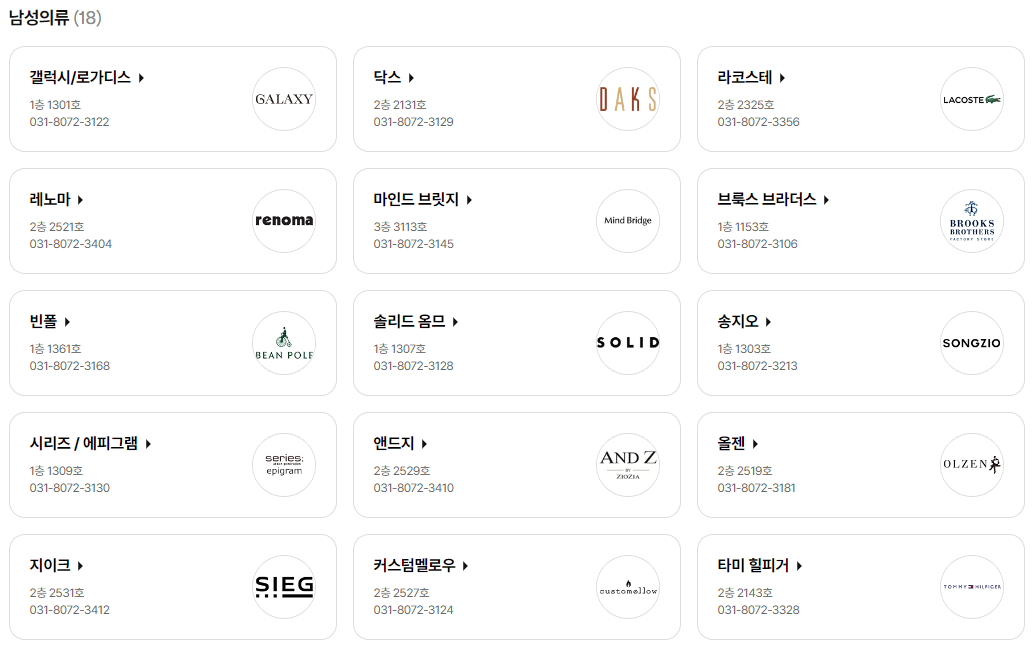 갤럭시/로가디스, 닥스, 라코스테, 레노마, 마인드 브릿지, 브룩스 브라더스,