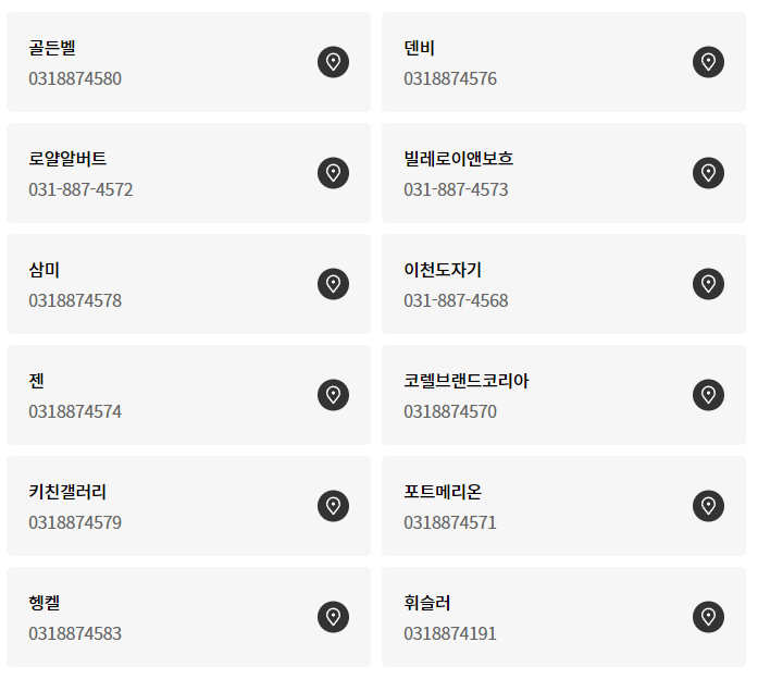 골든벨, 덴비, 로얄알버트, 빌레로이앤보흐, 삼미, 이천도자기, 젠, 코렐브랜드코리아, 키친갤러리, 포트메리온, 헹켈, 휘슬러