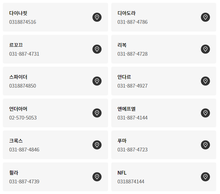 다이나핏, 디아도라, 르꼬끄, 리복, 스파이더, 안다르, 언더아머, 엔에프엘, 크록스, 푸마, 휠라, NFL