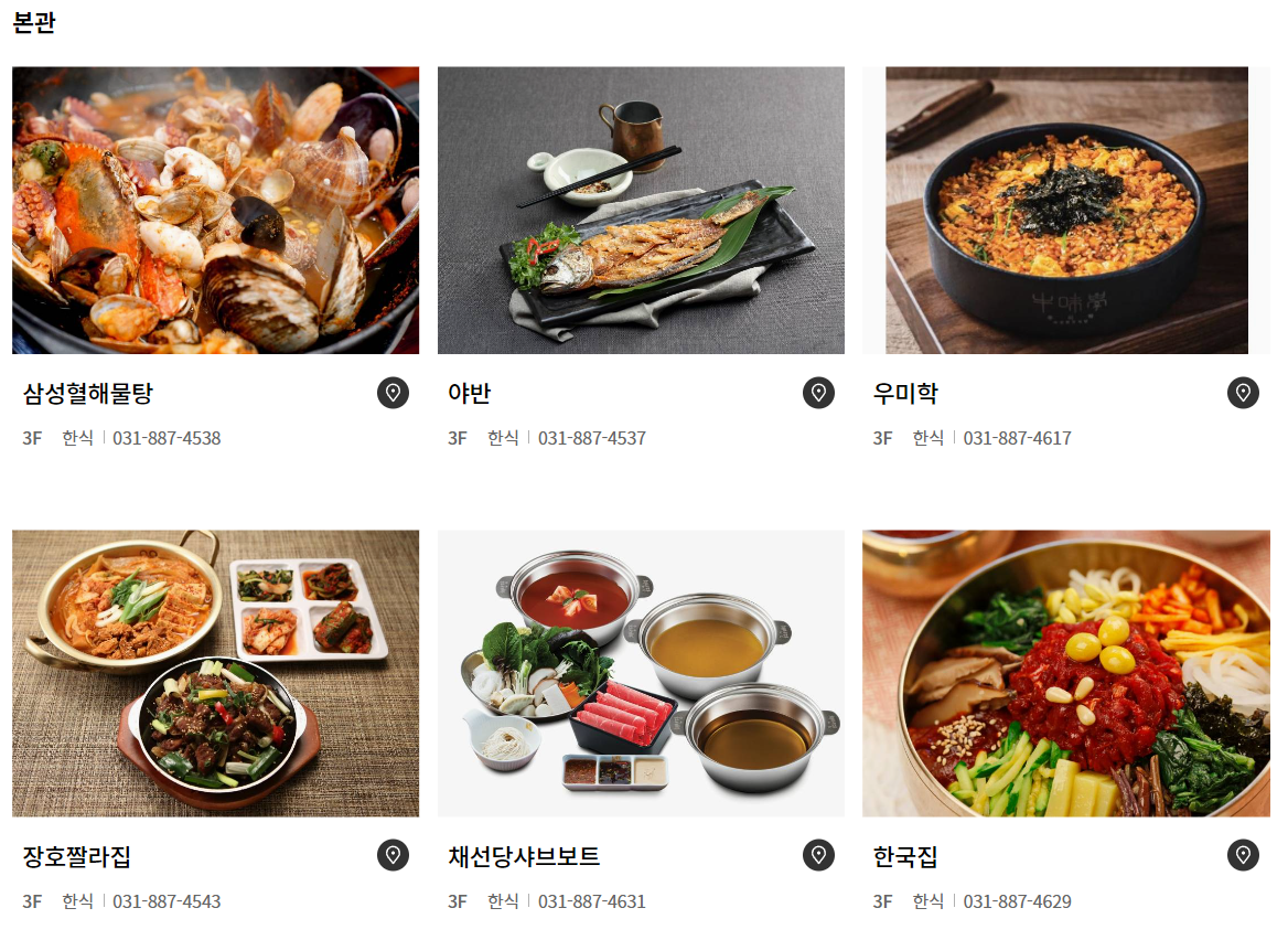 띤띤, 빠빠킹돈가스, 삼성혈해물탕, 스시덴고쿠, 야반, 오말리, 우미학, 장호짤라집, 차이홍, 채선당샤브보트, 한국집, 한와담소반, 황생가칼국수, 101번지 남산돈까스