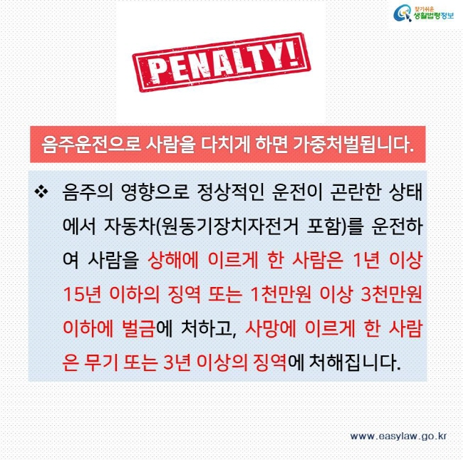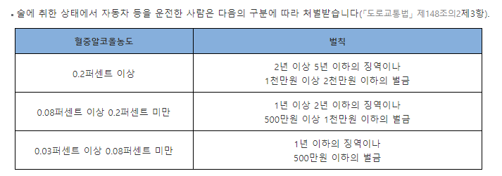 술에 취한 상태에서 자동차 등을 운전한 사람은 다음의 구분에 따라 처벌받습니다.