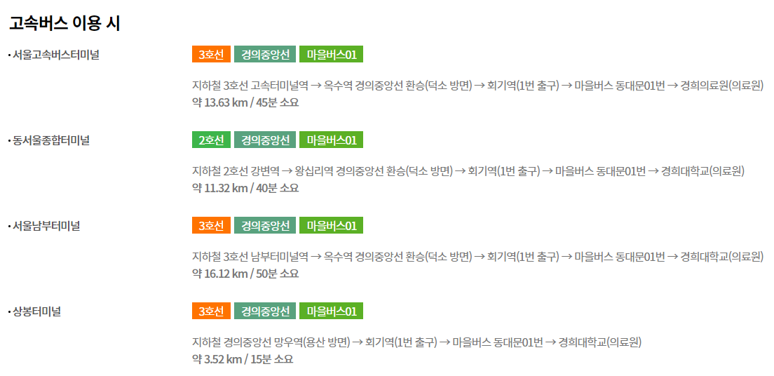 지하철 1호선 서울역(의정부 방면) → 회기역 1번 출구 → 마을버스 동대문 01번 → 경희대학교(의료원)
