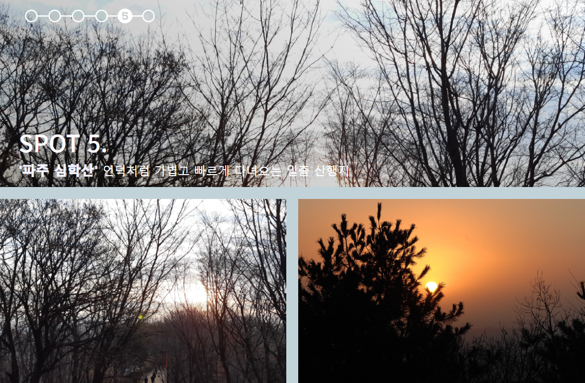 심학산은 간편하고 빠른 일출 산행지로 자유로변에 위치해 있습니다.해발 194m이지만 등반에서 일출 감상까지 30분이면 충분합니다.정상에서 바라보는 시원한 전망도 일품입니다.