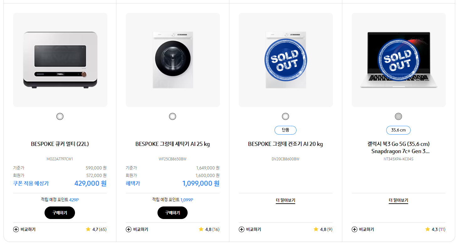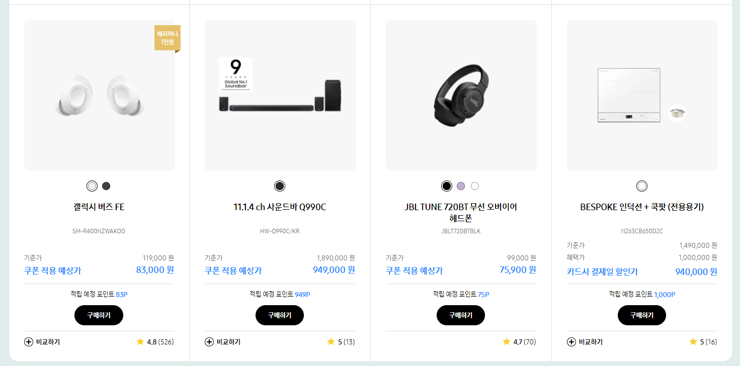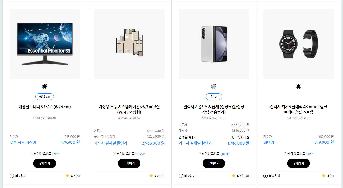 공기청정기, 가정용 무풍 시스템에어컨, 갤럭시 핸드폰, 갤럭시 워치, 갤럭시 버즈, 모니터
