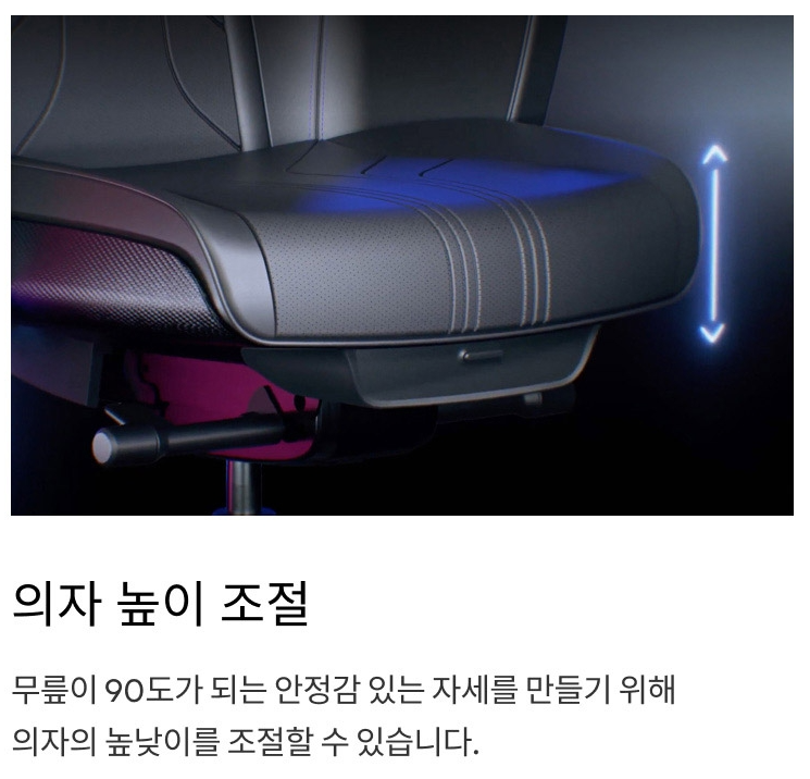 무릎이 90도가 되는 안정감 있는 자세를 만들기 위해 의자의 높낮이를 조절할 수 있습니다.
