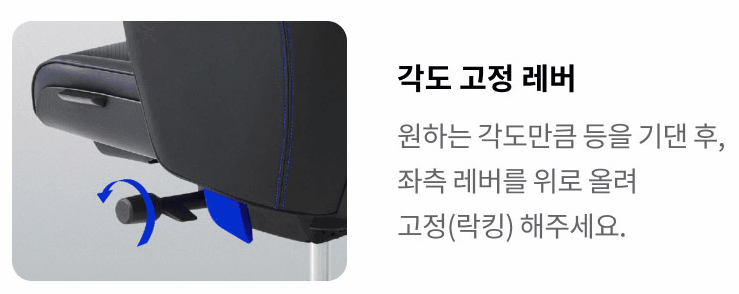 5단계 각도 설정 및 등판 고정(락킹) 가능합니다.90도부터 최대 120도까지 상황과 취향에 맞는 최적의 상태를 설정할 수 있습니다.