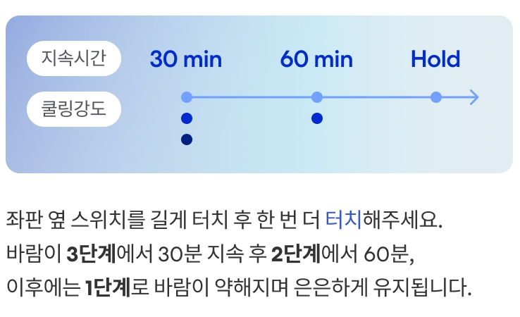 이후에는 1단계로 바람이 약해지며 은은하게 유지됩니다.