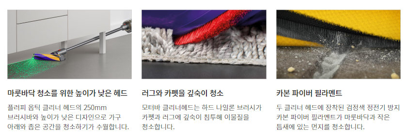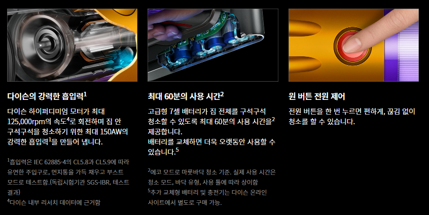 다이슨 하이퍼미디엄 모터가 최대 125,000 rpm의 속도로 회전하며집안 구석구석을 청소하기 위한 최대 150AW의 강력한 흡입력을 만들어 냅니다.