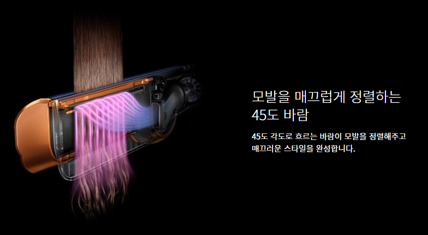 45도 각도로 흐르는 바람이 모발을 정렬해주고 매끄러운 스타일을 완성합니다.