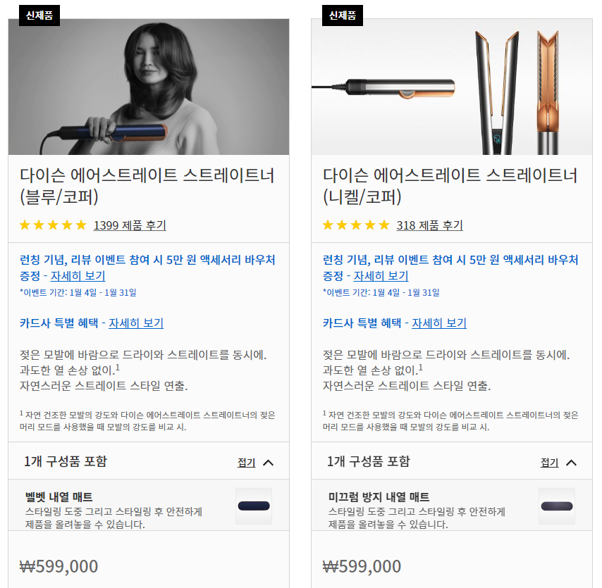 ⊙ 다이슨 에어스트레이트 스트레이트너 (니켈/코퍼) 가격 : 599,000원 - 미끄럼 방지 내열 매트(구성품 포함)