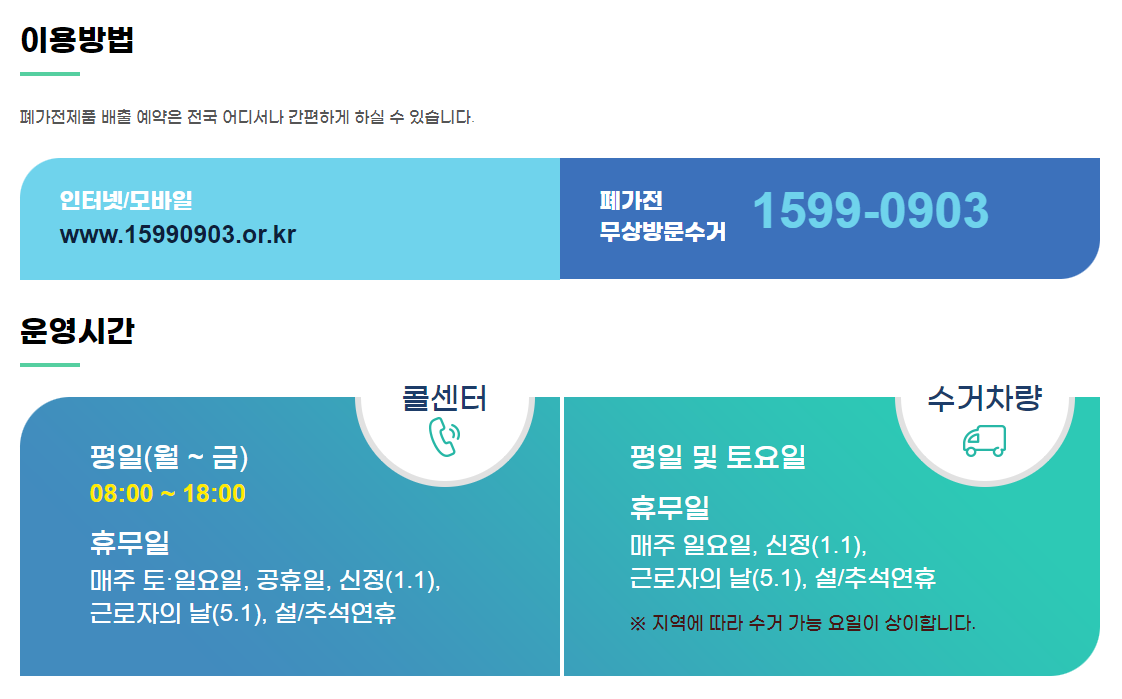 인터넷, 모바일 : WWW.15990903.or.kr (폐가전제품 배출예약시스템)