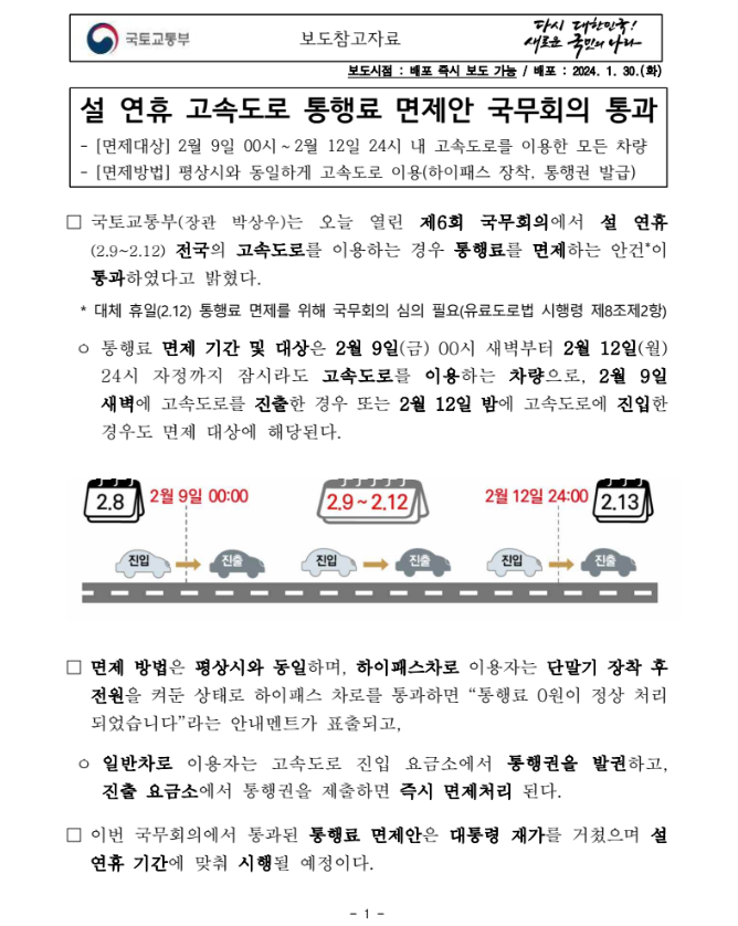 이번 국무회의에서 통과된 통행료 면제 안은 대통령 재가를 거쳤으며 설 연휴 기간에 맞춰 시행될 예정입니다.