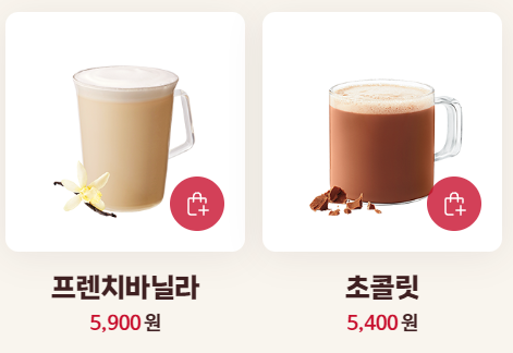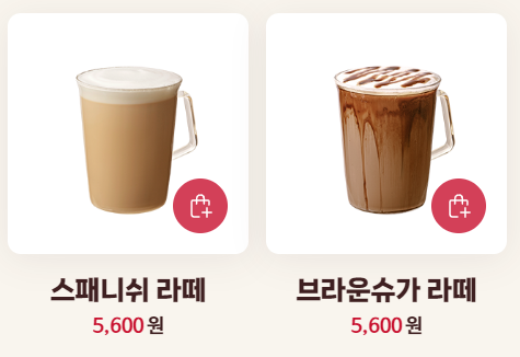 프렌치바닐라라떼, 카라멜라떼, 카페 모카, 스패니쉬 라떼, 브라운슈가 라떼