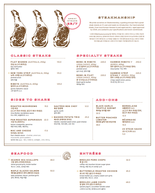 아주 까다로운 미식가의 취향마저도 완벽하게 만족시킬 수 있도록 준비된 최고 품질의 스테이크는 가장 고급스러운 제철 식재료, 그 위에 스테이크 본연의 대담한 맛에 집중함으로써 스테이크를 맛보는 경험을 '마이클 조던' 레벨로 끌어올리죠. 미국 외 지역에서는 최초로 한국의 인스파이어 엔터테인먼트 리조트에 오픈하였으며, 국내 유수 디자인 스튜디오인 '계선'이 인테리어 설계를 맡아 섬세하면서도 독창적인 인테리어를 선보입니다. 이와 함께 특별한 분에게 제공되는 프라이빗한 공간은 마이클조던스테이크 하우스에서의 경험을 이전과는 다른 새로운 차원으로 이끌어 냅니다.