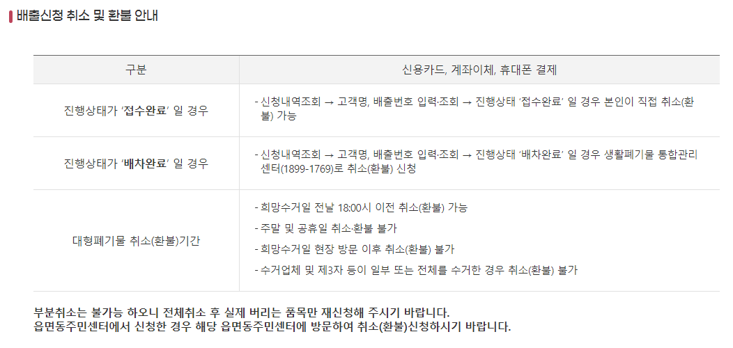신청내역조회 → 고객명, 배출번호 입력, 조회 → 진행상태 '배차완료일 경우 생활폐기물 통합관리센터 1899-1769로 취소(환불) 신청