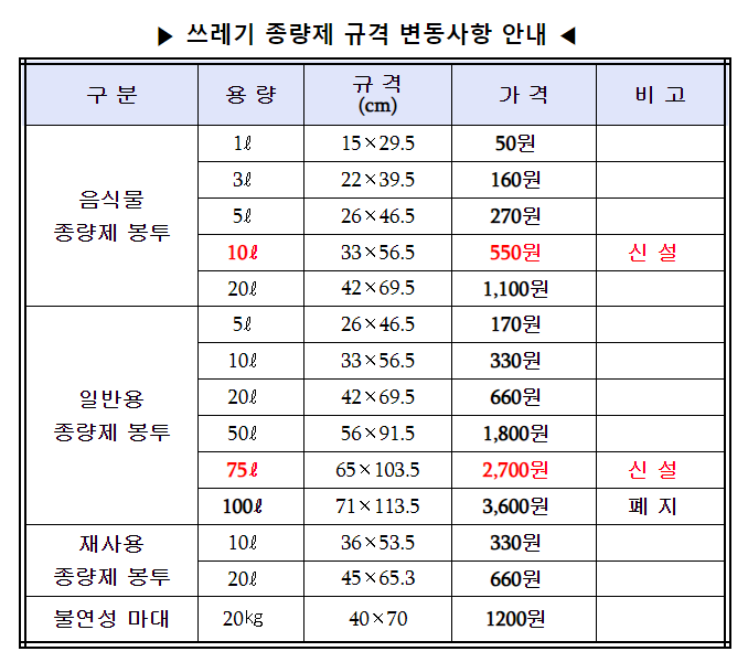 2020년 5월 15일 자로 일반용 종량제 봉투 100ℓ 폐지 및 음식물 종량제 봉투 10ℓ, 일반용 종량제 봉투 75ℓ 신설에 따른 규격 및 가격을 다음과 같이 안내드립니다.