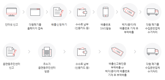 인터넷 신고, 읍면동주민센터 신고, 대형폐기물 스티커 판매업소 방문, "빼기"앱 다운로드