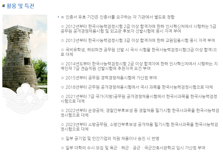 일부 공기업, 민간기업 채용 시 우대, 국비유학생, 해외파견 공무원 선발 시 국사 시험 대체, 교원임용시험 응시자격 부여